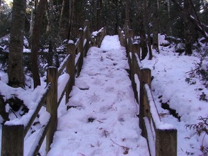 階段などの日陰部分は凍結していて、登り・降りとも滑りやすい。