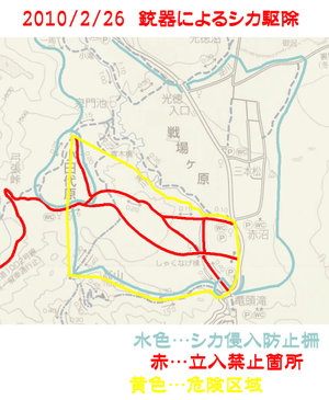明日、2010/2/26、戦場ヶ原シカ進入防止柵内に置いて、銃器を用いた有害鳥獣駆除が行われます。