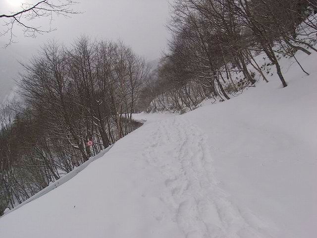 蓼に下る途中、やや上の斜面をトラバースする人影あり。