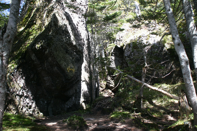 もう一度樹林に戻ると、あたかも山門のように巨石が。