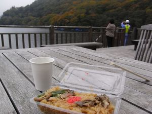 などと考えながら、ようやく色づきを増し始めた菖蒲の尾根を眺めつつ、ボートハウスのテラスで湯滝レストのマイタケご飯@300を食べていたのでした。
