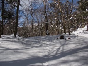 部分的に抜けるけど、基本は雪が薄いからアイゼンのほうが取り回し楽かもなぁ。