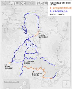 9/7時点ながら黒檜岳の情報を貰っていたのとで(メールがちゃんと届いていなくてさぁ…。スパム処理でもされたか?)、台風12号後の歩道MAPを更新。