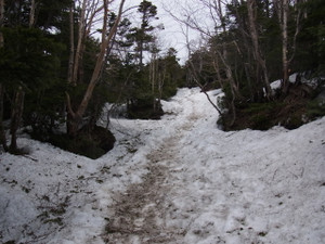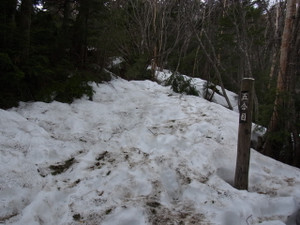 6合以上の岩場には雪が無く、林内の日陰部に雪というか踏み固められた氷がたまに。