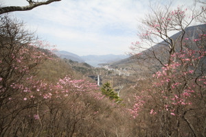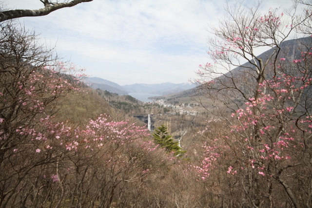 あとは、中禅寺湖北岸の赤岩のあちこちに見ごろとなったアカヤシオの姿が。