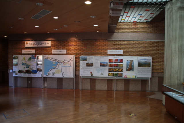 その奥には日光に自生するカエデ類の分岐式検索表(実物利用)、奥には中禅寺の街中にある色づく木の葉の所在地マップや、オススメ紅葉スポットなどの地図が並ぶ。