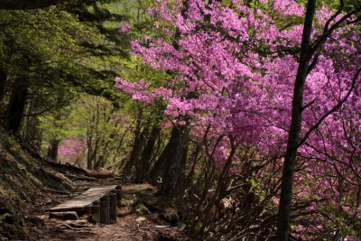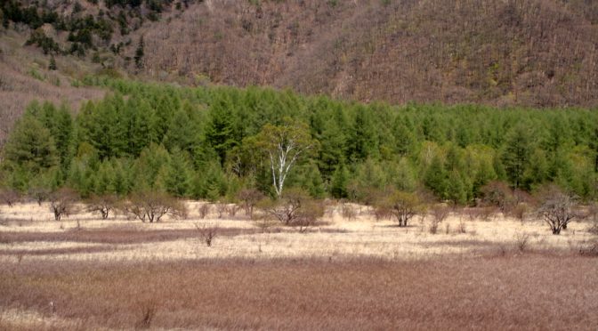 車窓から小田代のカラマツ新緑と貴婦人を一枚。